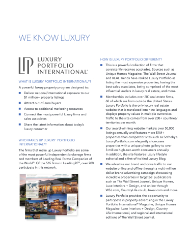 annually and features more $1M+ properties than competitor sites such as Sotheby’s LuxuryPortfolio com elegantly showcases properties with a a unique photo gallery to to over 3 million high-net-worth consumers annually In addition the site features luxury lifestyle editorial and a a a first-of-its kind Luxury Blog We advertise our our brand and and drive traffic to our our website online and offline through a a multi-million dollar brand advertising campaign showcasing incredible properties in in targeted publications such as The Wall Street Journal Unique Homes Luxe Interiors + Design and online through WSJ com com CountryLife co co co uk Juwai com com and more Luxury Portfolio provides the opportunity to participate in in in property advertising in in in the Luxury Portfolio International® Magazine Unique Homes Magazine Luxe Interiors + Design Country Life International and and regional and and international editions of The Wall Street Journal
