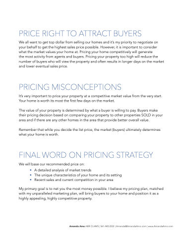• Recent sales and current competition in your area My primary goal is to net you the most money possible I believe my pricing plan matched with my unparalleled marketing plan will bring buyers to your home and position it it it as a a a a a a a highly highly appealing highly highly competitive property Amanda Amanda Amanda Amanda Amo Amo Amo ABR CLHMS | | | 561 440 2222 | | | Amanda@AmandaAmo com com | | | www AmandaAmo AmandaAmo com com