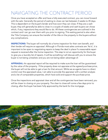 Once you you have have accepted an an an offer and have have a a a a a a a a a fully executed contract you you can move forward with the the sale Generally the the period of waiting to to close can last between 2 weeks to to 45 days This is is dependent on on the the the buyer’s lender and how soon they they can close If they they are a a a a a cash buyer buyer they will generally be able to close in a a a a a a couple of weeks and cash buyers can chose which if any inspections they would like to do All these contingencies are outlined in in in in the the the contract and I can go over them with you prior to signing This waiting period is is also when the the the the the Title Company can ensure the the the the the transfer of the the the the the title on the the the the the property to the the the the the buyers without any complications INSPECTIONS: The buyer will will normally do a a a a a a a a a a a home inspection for their their own benefit and their lender will require an appraisal Although in Florida most sales contracts are ‘As Is’ it is is important to to to be open to to to negotiating repairs to to to keep the deal in in place if a a a a a a a a a reasonable repair repair request is is received after the the home inspection This step Is not an opportunity for the the buyer to to give you you a a a laundry list of repairs It will will be something I I will will discuss with you you to to ensure the buyer is is not not being being unrealistic and you are not not being being taken advantage of APPRAISAL: An appraisal report will will be be required to make sure the the the the the loan will will be be guaranteed by the the the the value of the the the the property property If the the the the property property does not appraise at the the the the agreed purchase price the buyer will not be able to get a a a a a a a a loan for that amount While we as agents have no no direct control over the the appraised value I am able to provide the the appraiser with a a a a a a a a a a written analysis and and a a a a a a a list of comparable properties which have sold and and support the purchase price Once the the inspections and and appraisal clear and and all the the contingencies have been removed you will will be closer to to to closing on your property The clear to to to close close will will come a a a few days prior to to to closing after the the the buyer has been fully approved by the the the bank for the the the mortgage