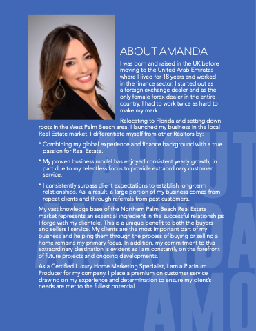 * Combining my global experience and finance background with a a a a a a a a true passion for Real Estate * My proven business model has enjoyed consistent yearly growth in in in part due to to to my relentless focus to to to provide extraordinary customer service * I consistently surpass client expectations to establish long-term relationships As a a a a a a a a a a a result a a a a a a a a a a a large portion of my business comes from from AMAND repeat clients and through referrals from past customers My vast knowledge base of the the the Northern Palm Beach Real Estate market represents an essential ingredient in in the the the the successful relationships I I forge with my my clientele This is is a a a a a a a a a unique benefit to both the the the buyers and and sellers I I service My clients are the the the the most important part of of my my business and and helping them through the the the process of of buying or or selling a a a a a a a a a home remains my my primary focus In addition my my commitment to this extraordinary destination is is evident as I I am constantly on on on on on on the forefront of future projects and ongoing developments As a a a a a a a a a Certified Luxury Home Marketing Specialist I I am a a a a a a a a a Platinum Producer for my my my company I I place a a a a a a a a a a a a premium on on on customer service drawing on on on my my my experience and determination to to to ensure my my my client’s needs are met to the fullest potential T A